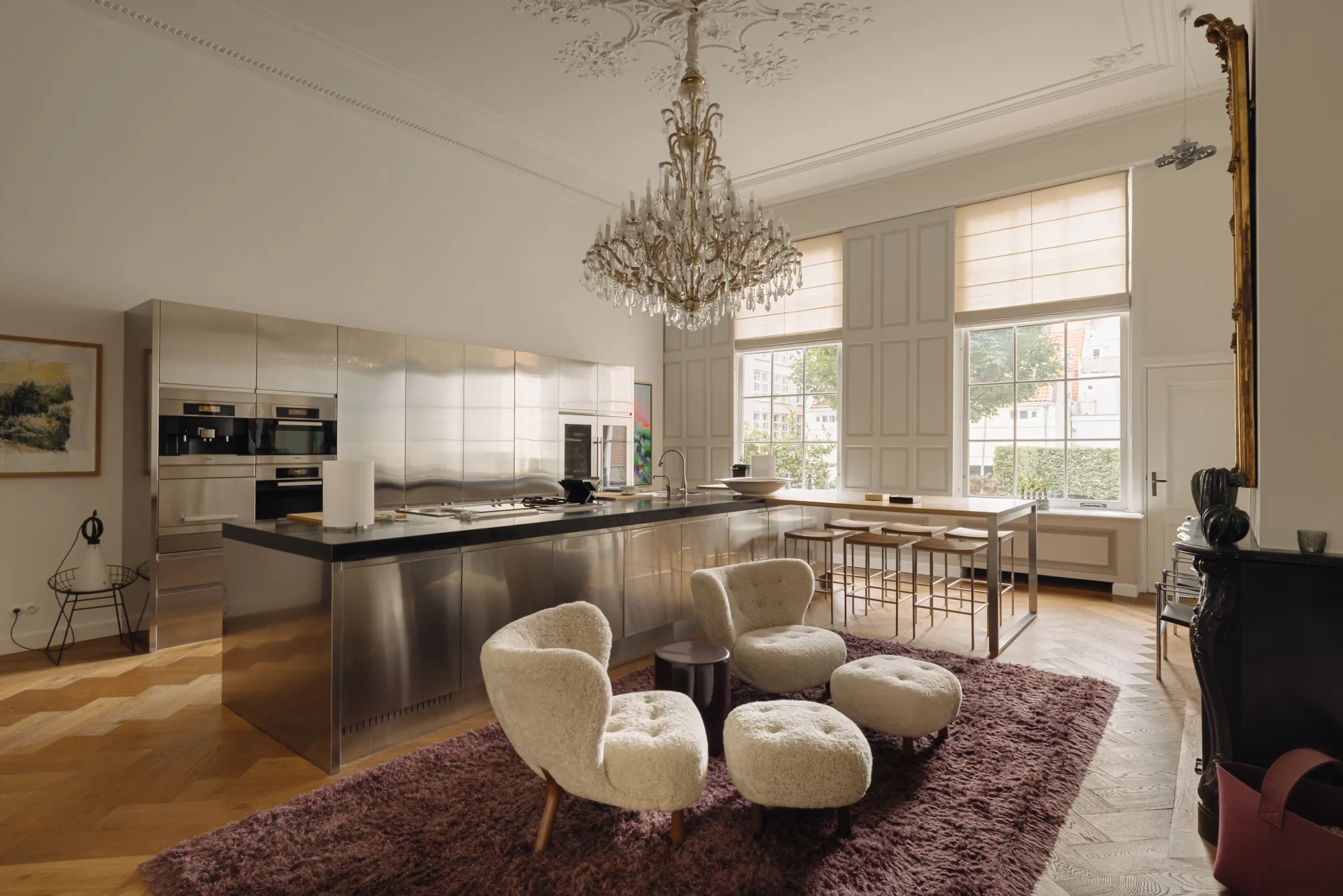 De open keuken werd volledig nieuw ontworpen met RVS werkbladen en een imposante kroonluchter als middelpunt. Alle technische installaties zijn vernieuwd, inclusief vloerverwarming en slimme domotica.